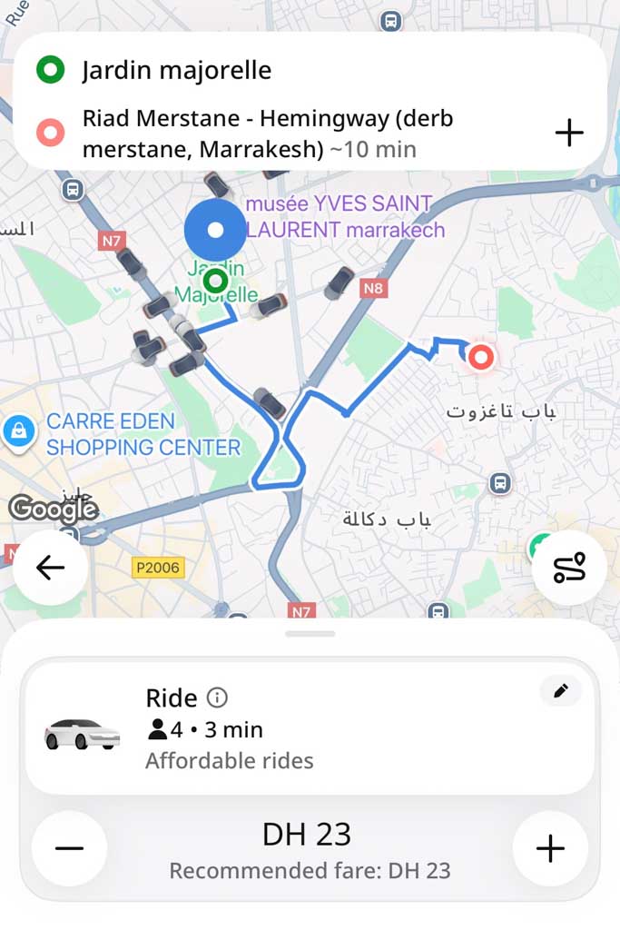 Veel bezienswaardigheden in Marrakech kun je lopend bereiken, maar soms is een taxi handig. Installeer daarvoor de app InDrive. Je vult je bestemming in en zij geven een prijsvoorstel. Vaak is dat voorstel heel laag, dus verhoog het gerust met twintig dirham zodat chauffeurs het sneller accepteren. Houd er rekening mee dat InDrive niet altijd werkt. De bekende gele taxiโs zijn niet blij met de app en chauffeurs van InDrive durven soms niet te stoppen als er gele taxiโs in de buurt staan. Werkt de app niet, dan is een gele taxi aanhouden het snelst. Spreek altijd vooraf een prijs af en laat je niet gek maken. Ze beginnen altijd hoog. Voor een rit van tien minuten betaal je ongeveer 50 dirham.