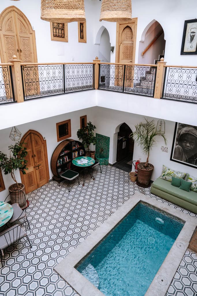 Een riad is een traditioneel Marokkaans huis met een binnentuin in het midden. De kamers liggen rondom deze binnentuin, waardoor het voelt alsof je in een verborgen oase verblijft. Achter een simpele deur in een drukke straat stap je ineens een wereld binnen van stilte, zachte kleuren, planten, fonkelende lantaarns en vaak een dakterras met uitzicht over de medina. Het is de perfecte plek om tot rust te komen na een dag door de souks dwalen en daarmee de beste tip om te verblijven in Marrakech tijdens een stedentrip. In een riad kun je rekenen op een heerlijk Marokkaans ontbijt (met vers brood, jam en pannenkoekjes), gastvrije hosts en mooie kamers met authentieke details. Verwacht geen grote hotels met liften of kofferservices. Juist de kleinschaligheid en persoonlijke sfeer maakt een verblijf in een riad zo bijzonder. Onze favorieten zijn Riad Merstane (foto links) en Riad Le Petit Joyau (foto rechts.)