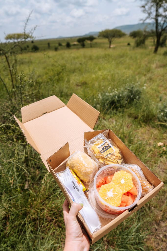 In tegenstelling tot landen zoals Zuid-Afrika kom je onderweg in Tanzania geen restaurants tegen. Het is gebruikelijk dat je vanuit je lodge een lunchpakket meekrijgt dat je opeet bij een picknickplaats in het park. Wat erin zit verschilt, maar meestal bestaat het uit een broodje of rijst met groenten, een sapje, wat chips, een koek en fruit. Je kunt eventueel zelf nog wat snacks of snoep meenemen vanuit huis. In de ochtend en avond eet je bij je lodge. Zorg dat je altijd voldoende water bij je hebt, want door de hitte drink je meer dan je denkt. In de auto zit vaak een koelbox om je drinken koel te houden en bij picknickplaatsen staat soms een koffiekar. Goed om te weten is dat er nergens prullenbakken zijn, dus neem je afval altijd mee en lever het bij aankomst bij je volgende lodge in. Daar zijn ze aan gewend.
