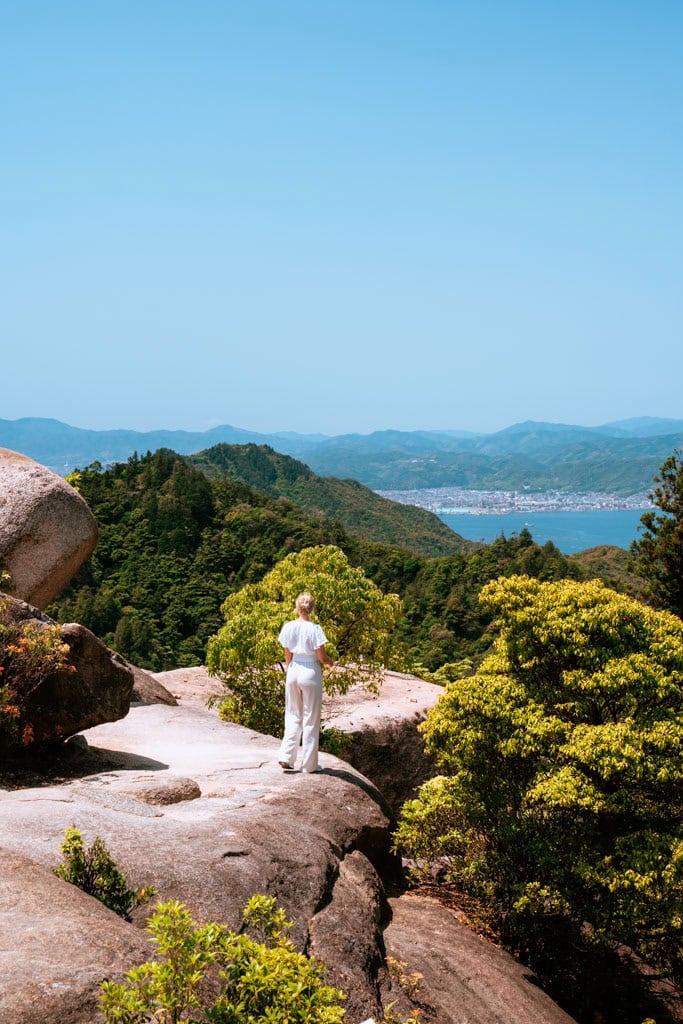 Een dagtrip naar Miyajima eiland is iets wat je echt moet doen vanuit Hiroshima. Vanaf Hiroshima Station pak je de trein naar Miyajimaguchi (ongeveer 30 minuten) en daar stap je op de ferry. Tien minuten later sta je op het eiland. Loop bij aankomst eerst naar de bekende Torii-poort in het water. Het is het bekende plaatje van Miyajima en leuk om even te bekijken of te fotograferen. Ga daarna direct naar de kabelbaan richting Mount Misen. Doe dit vroeg, want aan het eind van de ochtend kan de wachtrij extreem lang worden. Vanaf het middenstation kan je nog een stuk omhoog wandelen naar de top. Het uitzicht over de baai is prachtig en bij helder weer zie je tientallen eilandjes liggen.