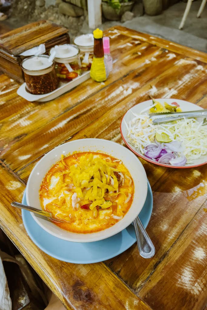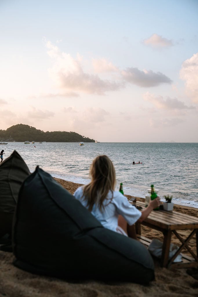 Fisherman’s Village in Bophut is een van de bekendste plekken op Koh Samui om ’s avonds naartoe te gaan. Het oude vissersdorp ligt direct aan het strand en hier vind je restaurants, bars en kleine winkels. Eerlijk is eerlijk, Fisherman’s Village is behoorlijk toeristisch. Toch is het een leuke plek om een avond rond te lopen, vooral als de straat vol staat met kraampjes waar je Thaise snacks, smoothies en souvenirs kunt vinden. Wij zijn uiteindelijk bij Coco Tam’s neergeploft op een zitzak met een biertje om naar de zonsondergang te kijken. Een hele chille plek direct aan het strand. Rond 19.15 uur is er ook een fire show wat de sfeer nog leuker maakt. Heb je zin in Thais eten, dan is Ran Khang Non een aanrader. Hier kun je een heerlijke Khao Soi bestellen, een verslavend lekker Noord-Thais gerecht dat we zelf veel aten in Chiang Mai en Pai.