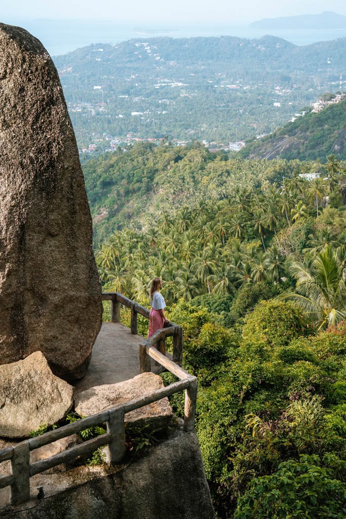 Overlap Stone 2 is een van de meest spectaculaire uitzichtpunten op Koh Samui. Boven op een heuvel ligt een enorme ronde rots die lijkt te balanceren op de rand van de berg. Vanaf hier kijk je uit over de groene heuvels van het eiland en de zee in de verte.